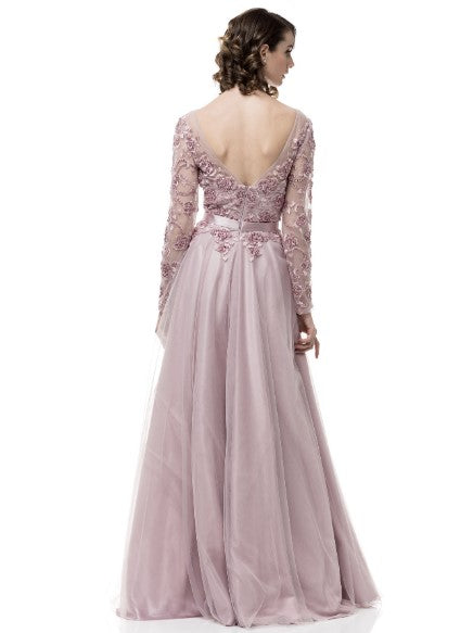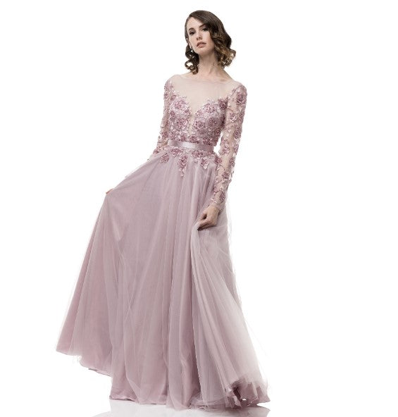 Beautiful gown with modest coverage and full length sleeves. It comes with floral and beaded details cut in an A-line silhouette. 100% polyester, tulle, lace and a fixed belt. This is a perfect choice for mother-of-the-bride or anyone that is looking for extra coverage.