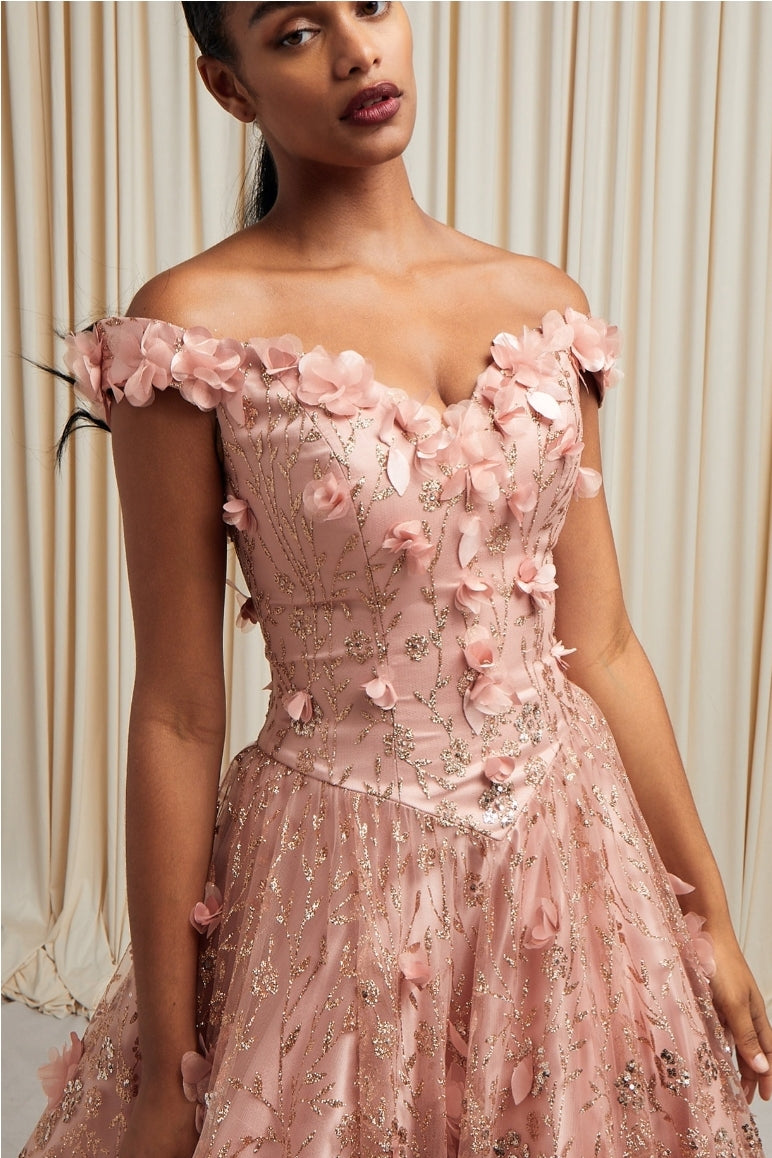 Introducing Bicici & Coty's CB17091 - an exquisite off shoulder, sweetheart ball gown with a lace up back. Perfect for a sweet 16 or quinceanera, this gown features delicate flower accents for a touch of romance. Elevate your special occasion with this luxurious and sophisticated piece.