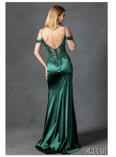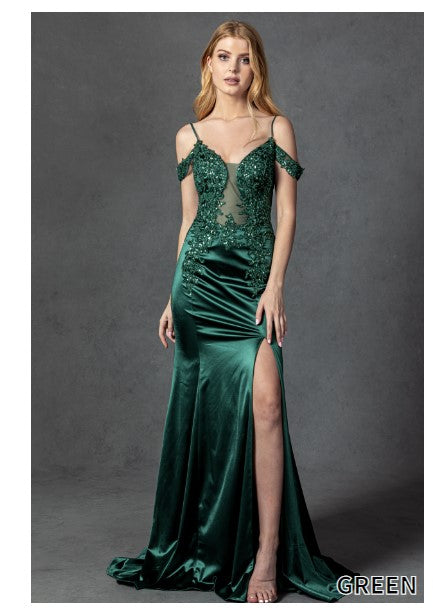 Gorgeous satin gown with a sweetheart neckline and elegant lace details. Low scooped back, off-the-shoulder sleeves and an open leg slit. Perfect for prom, galas, black tie and bridesmaids!