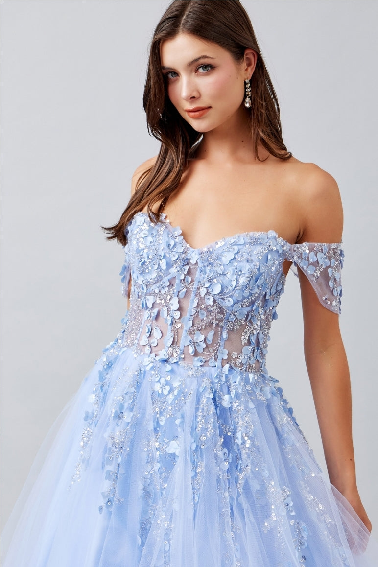 Indulge in the opulence of the Bicici & Coty KL2069. This sleeveless ballgown features a sweetheart neckline and a lace-up back with a corset for a perfect fit. Adorned with delicate flower details and finished with an elegant off-the-shoulder look, this dress is sure to make you feel like a work of art.