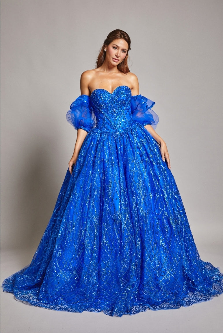 Bicici & Coty LL2022 is a statement-making ballgown for the modern romantic. Crafted from layers of delicate tulle and glitter embroidery atop sequins, this off-shoulder dress features a sweetheart neckline and a lace up back for an exquisite silhouette and precious look. Perfect for a luxurious evening affair.