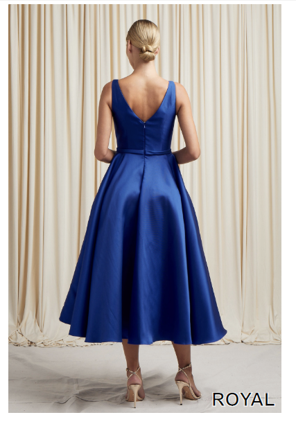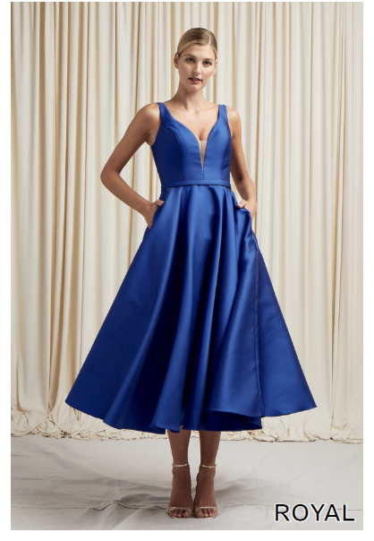 Beautiful, classic gown in Hunter Green and Royal Blue. Made of mikado fabric with side pockets and a scooped back. This timeless dress is perfect for cocktail hours and formal parties!