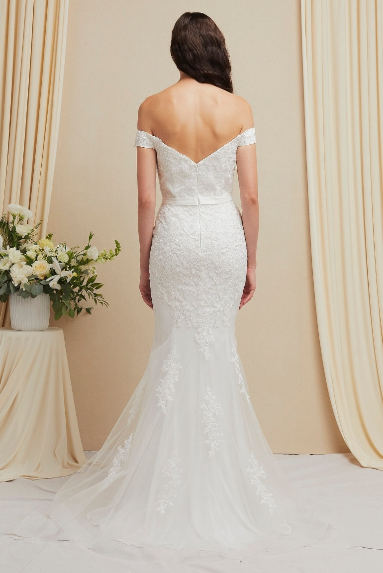 The Bicici & Coty MZW5380 wedding gown features an off-shoulder sweetheart neckline, creating a flattering silhouette with an elongated trumpet-cut skirt. The gown is crafted from premium polyester and tulle fabric, detailed with exquisite embroidery and encrusted with shimmering crystals. Celebrate your special day with sophisticated elegance in this timeless design.
