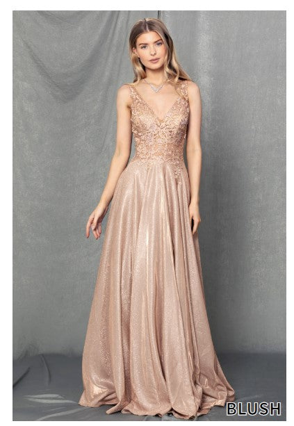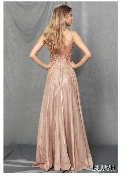 Shimmer crepe dress in a classic A line silhouette. Open slit, V neckline and low V back. Perfect for prom and pageants!