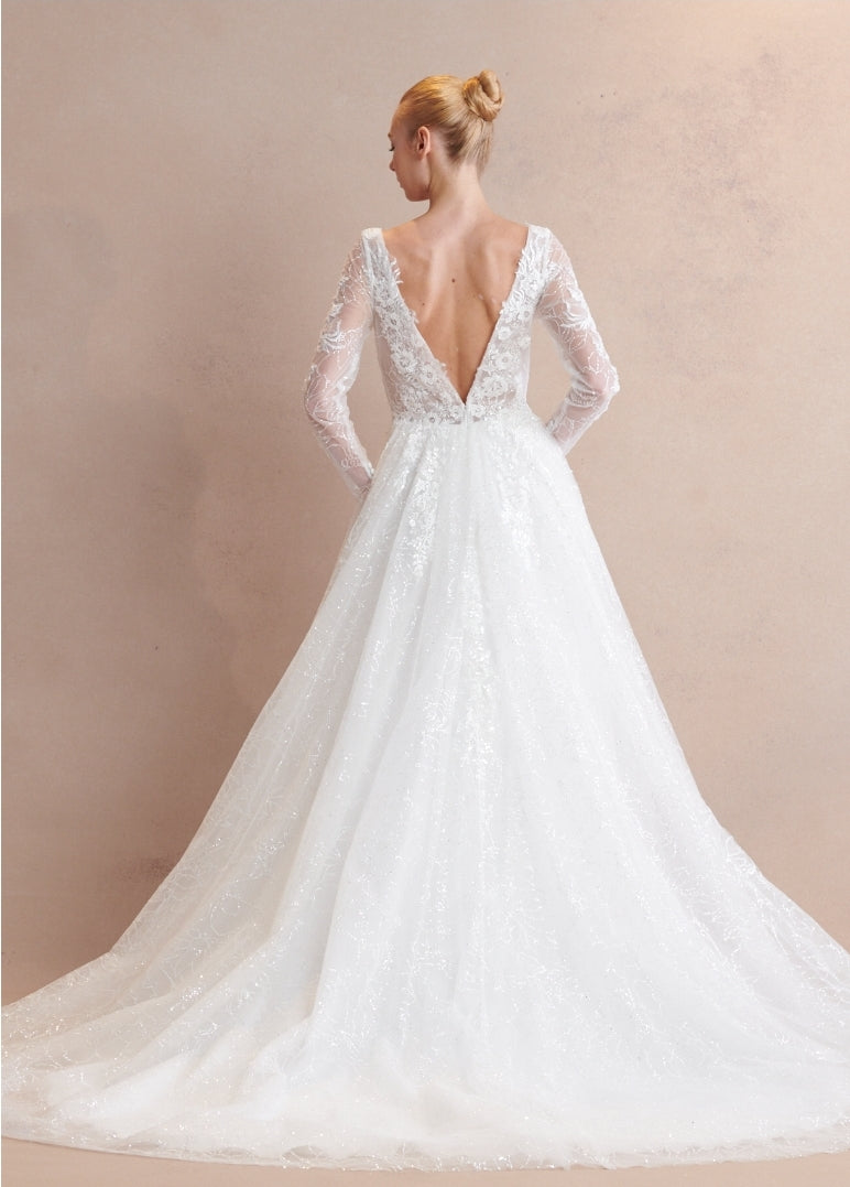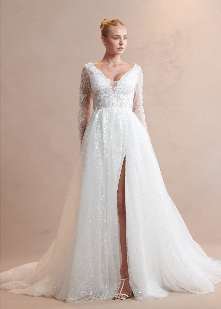 Elevate your wedding elegance with our Bicici & Coty ACW29068 gown. Featuring a flattering v-neck and long sleeves, this ballgown exudes luxury and sophistication. Crafted with lace detailing and a stunning train, this dress will make you feel like a work of art as you walk down the aisle. A leg slit adds a touch of modernity to this timeless piece.