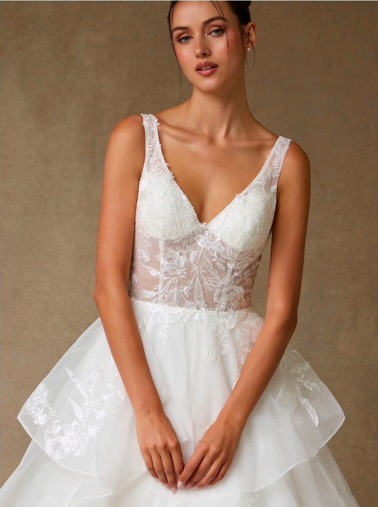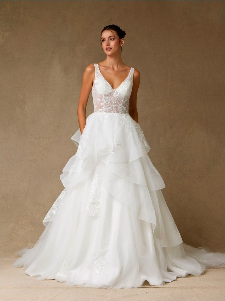 This stunning ball gown features cascading tiered ruffles that create dramatic movement and elegance. Intricate embroidered details adorn the bodice, while a cross-tied back and open back design offer a modern, romantic silhouette. Practical hidden pockets provide everyday functionality without compromising style. Perfect for weddings and formal occasions, this gown combines timeless sophistication with contemporary flair.