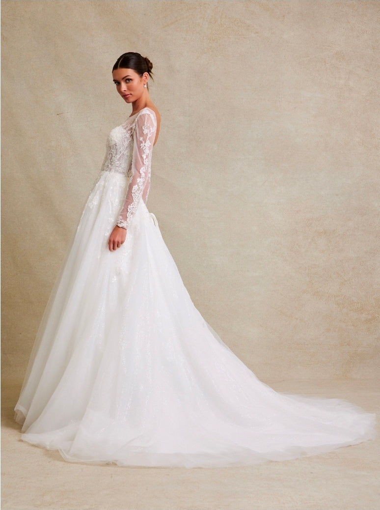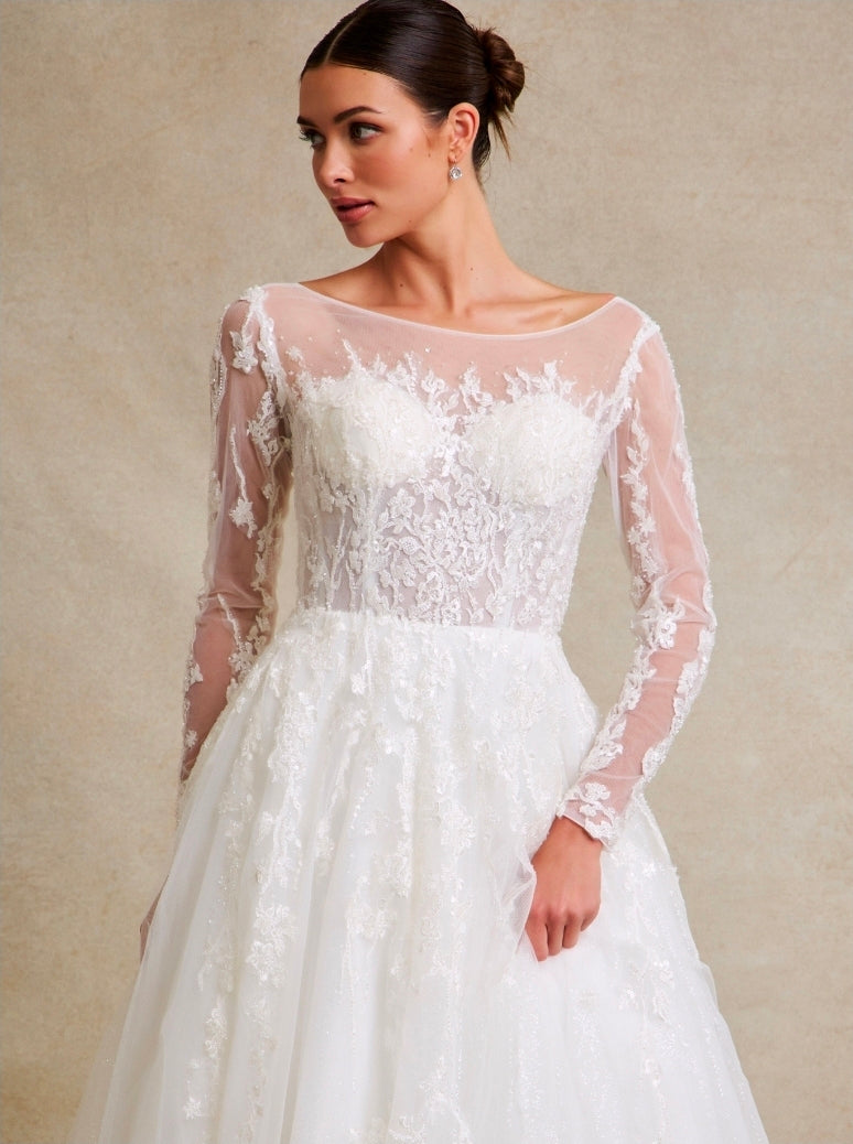 Embrace timeless elegance with this sophisticated wedding gown, designed for the modern bride seeking modest coverage without compromising on style. The graceful A-line silhouette flows beautifully from a classic bateau neckline, while delicate lace adorns the back with an intricate lace-up closure that adds an unexpected touch of romance. Long sleeves provide refined coverage, and the ethereal tulle construction creates movement and dimension as you walk. A sweeping train completes this enchanting bridal look, perfect for a ceremony that celebrates both grace and individuality.