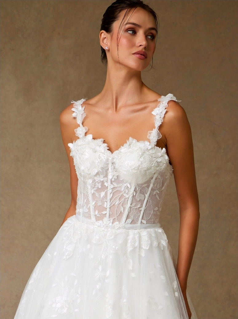 Walk down the aisle in timeless elegance with this stunning A-line wedding gown. Featuring a sweetheart neckline and sleeveless design, the fitted corset bodice showcases intricate embroidery, delicate lace, and sparkling crystals that catch the light beautifully. The voluminous tulle skirt flows into a graceful train, while beading and sequins add luxurious dimension throughout. The romantic lace-up back provides a classic finishing touch. Perfect for the bride seeking a gown that balances ethereal beauty with refined sophistication.