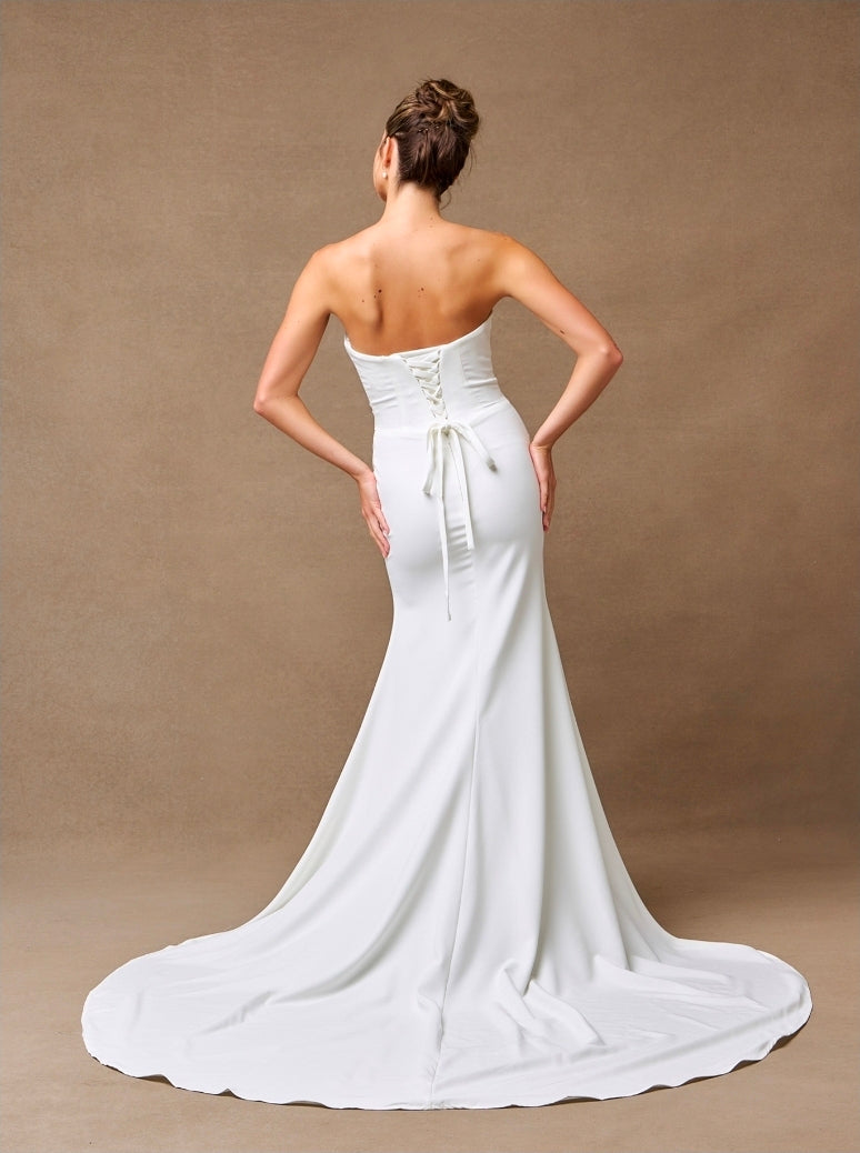 This strapless wedding gown features an elegant sweetheart neckline and sleek sheath silhouette that hugs the hips beautifully. Crafted from luxurious stretch crepe, the gown offers refined comfort and movement throughout your celebration. A tasteful slit adds modern sophistication to the timeless design. Perfect for the bride seeking understated elegance and impeccable tailoring on her special day.