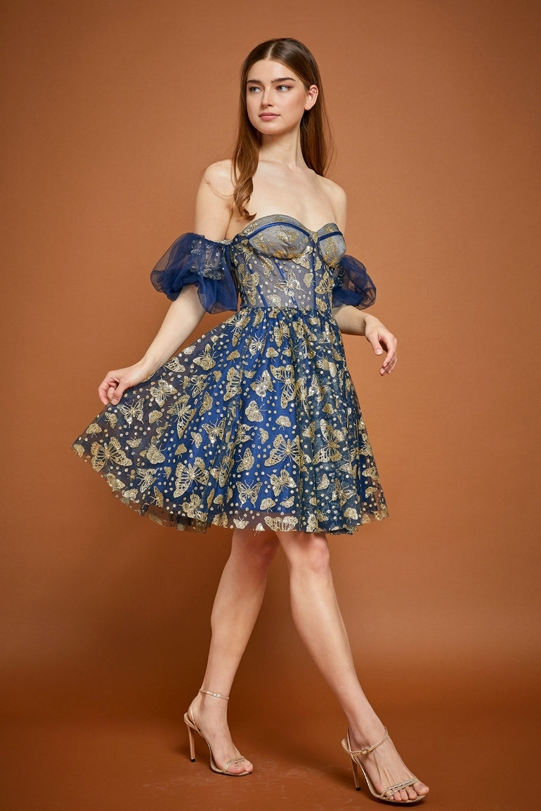 This stunning MD2317S dress from Bicici & Coty is sure to turn heads. It features short sleeves, an off-shoulder sweetheart neckline, a corset top, and a tulle skirt, all adorned with glitter, embroidery, and sequins. The lace up back ensures a perfect fit. Look and feel your best with this luxurious dress.
