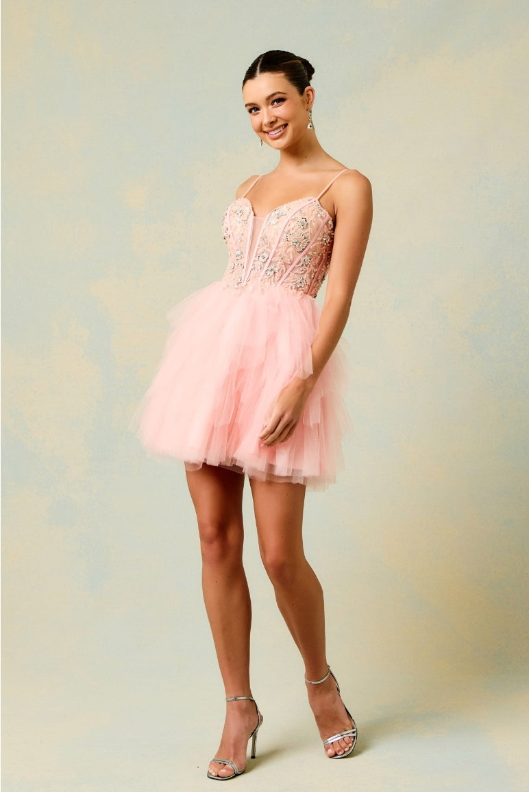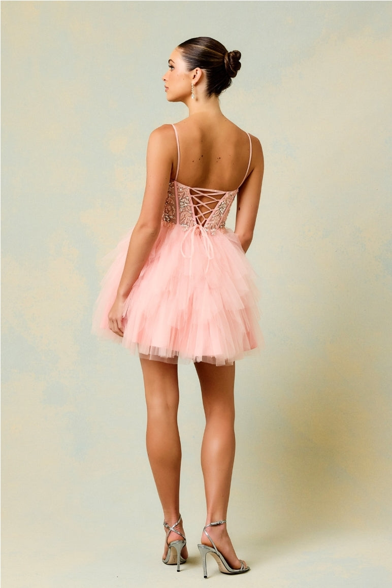 Indulge in luxury with our Bicici & Coty SR2420S. This sleeveless cocktail dress features a flattering V-neck and a stunning lace-up back. Perfect for homecoming or any special occasion, the tulle skirt adds a touch of elegance while ensuring a comfortable fit. Elevate your style game with this exclusive piece.