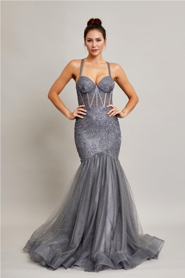 Become the belle of the ball in our Bicici & Coty DA2301 gown. This sleeveless dress features a sweetheart neckline and corset detailing, accentuating your figure. The mermaid silhouette and tulle skirt create a timeless, elegant look. Lace up the back for a perfect fit and feel like royalty in this luxurious gown.