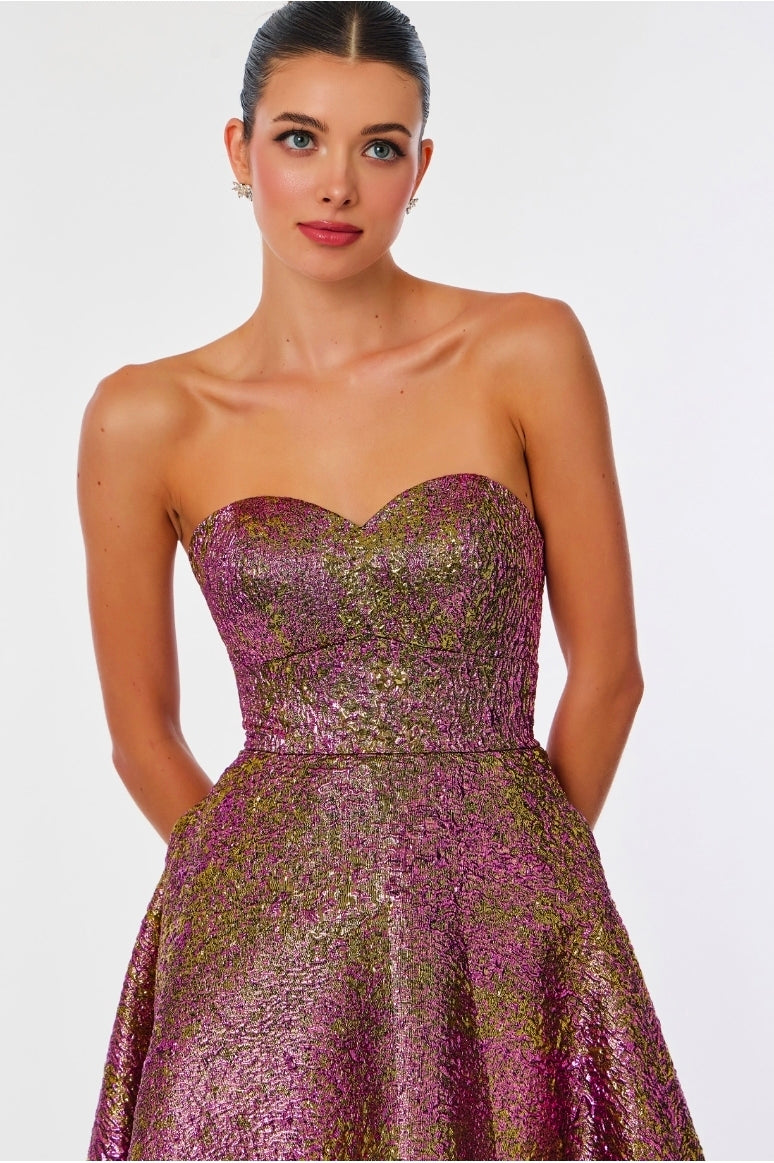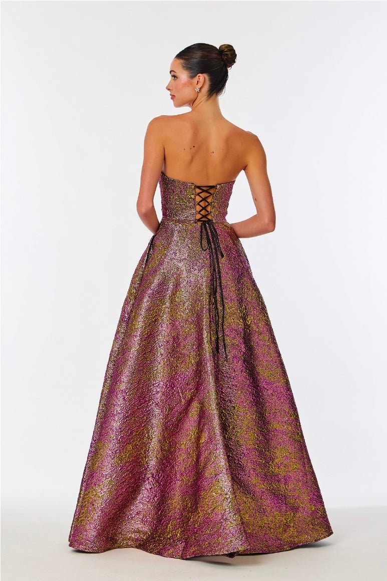 Elevate your evening with this stunning strapless gown featuring a sweetheart neckline and graceful A-line silhouette. Crafted from luxurious 100% polyester with an intricate jacquard print and shimmering metallic accents, this dress exudes timeless elegance. The lace-up back adds an alluring detail, while convenient side pockets offer practical sophistication. Perfect for galas, formal events, and unforgettable nights.