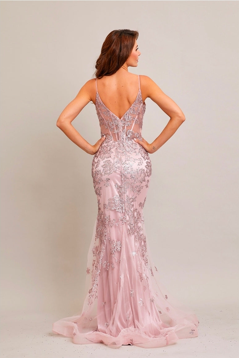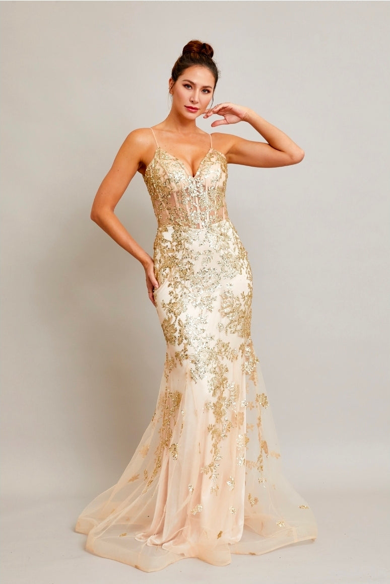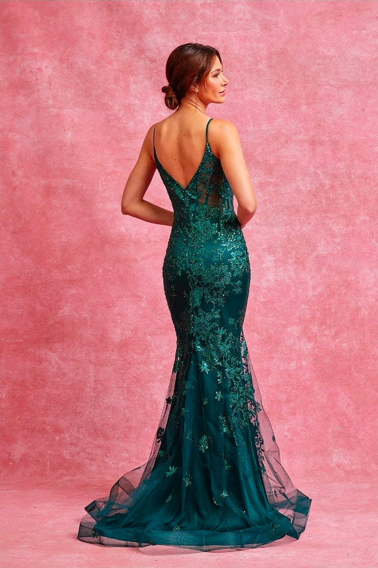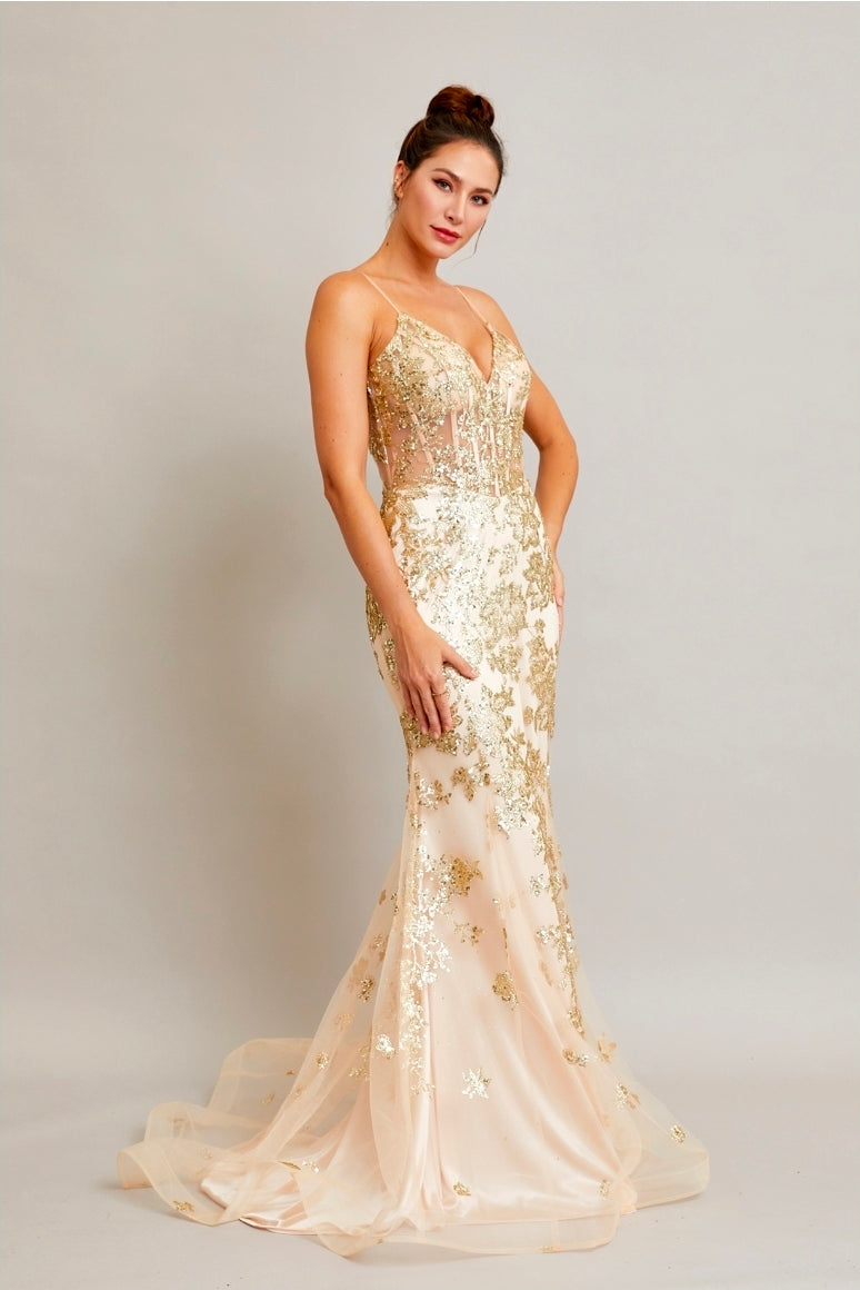 Embrace timeless elegance with this stunning sleeveless mermaid gown. The sweetheart neckline and delicate spaghetti straps frame the shoulders beautifully, while shimmering glitter fabric catches the light with every movement. A structured corset bodice hugs the curves, flowing into a dramatic mermaid silhouette that flatters the hips. The lace-up back adds an alluring detail and allows for a customized fit. Perfect for formal events, galas, or unforgettable evenings where sophistication meets glamour.