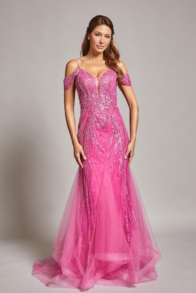 The Bicici & Coty PS5191 is a luxurious and timeless piece boasting exquisite details. Crafted from 100% polyester, it features a mermaid silhouette with off-shoulder, v-neck, tulle and glitter embroidery, as well as beading, crystals, pearls and sequins. The design is completed with a lace up back.
