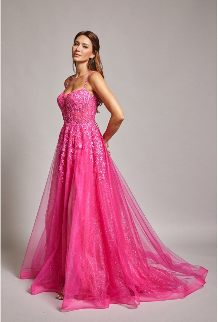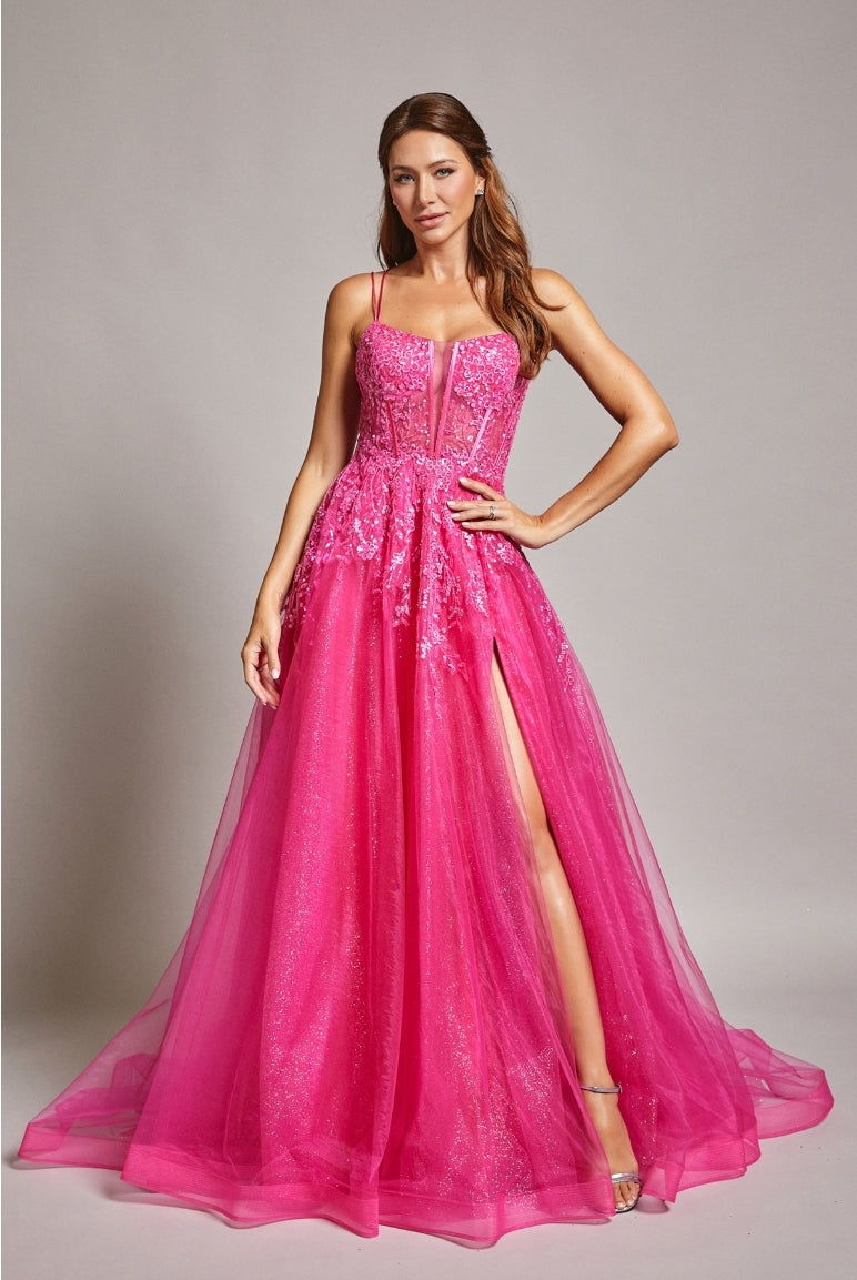This elegant Bicici & Coty SP23012 A-Line gown is crafted from luxuriously sculpted tulle and adorned with intricate embroidery, lace, sequins, and dazzling crystals. The sweetheart neckline corset is truly captivating, with its delicate lace-up back and mesmerizing slit. Perfect for making a statement at any special occasion.