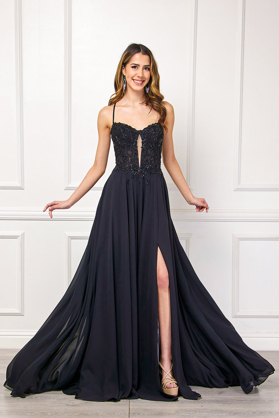 Indulge in luxury with the Amelia Couture 7066 - Black A-line Gown. The a-line silhouette and leg slit add a touch of elegance, while the spaghetti straps and corset top provide a flattering fit. Adorned with intricate lace detailing on the bodice, this gown is a true work of art.