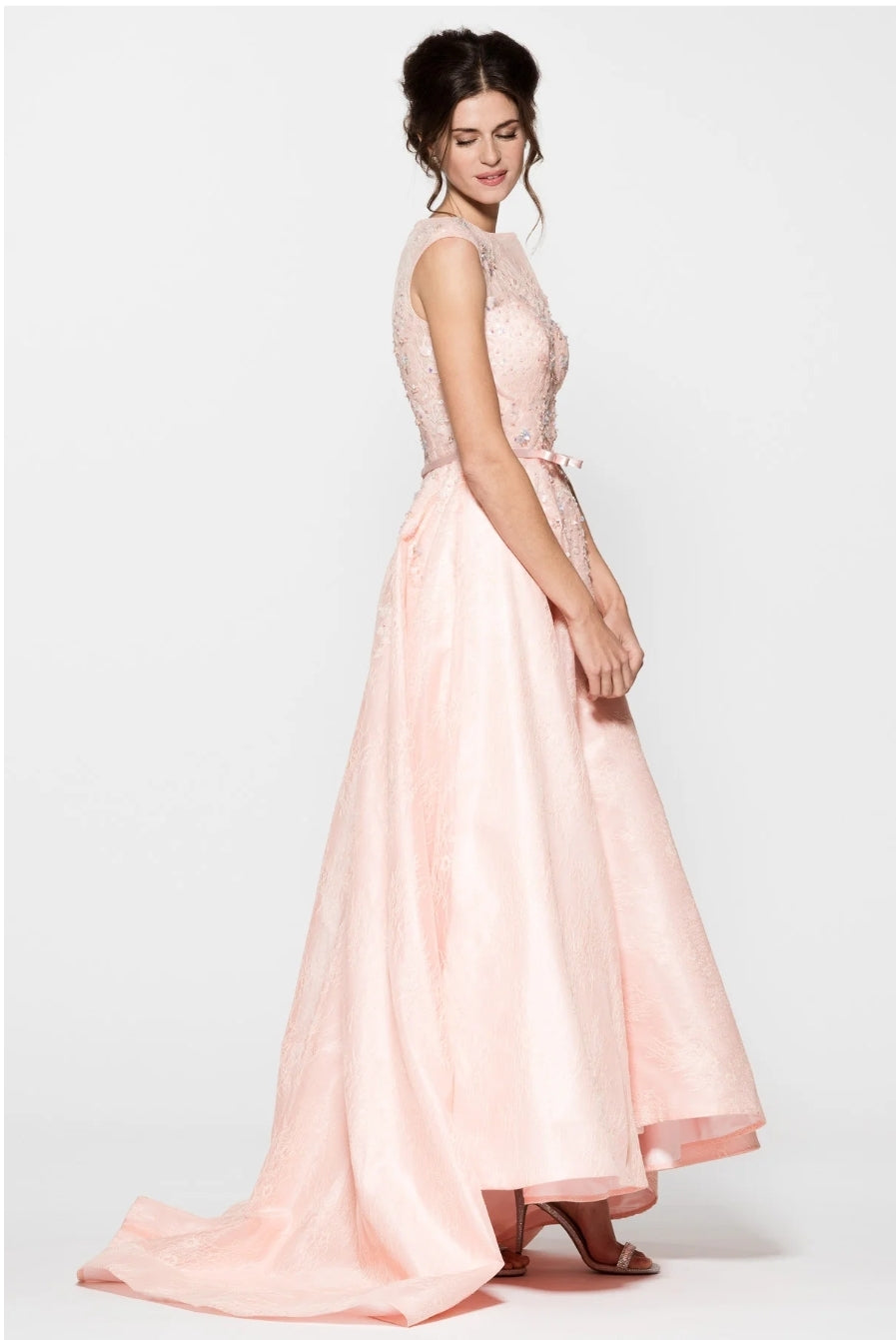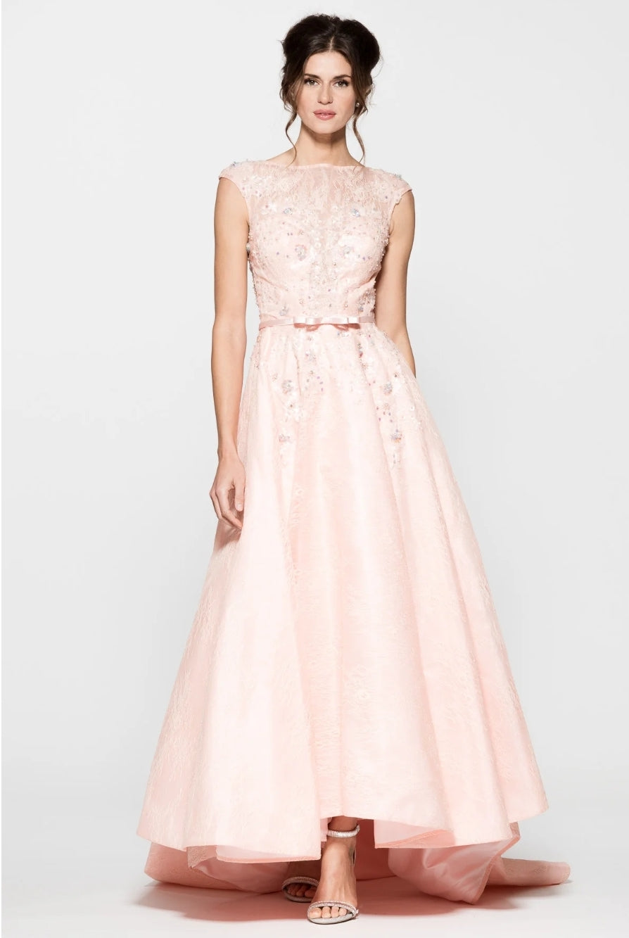This Bicici & Coty CB12207 gown is perfect for special occasions. The stunning lace and beading create a timeless elegance and the fixed belt accentuates the waistline. The bateau neckline, cap sleeves, and A-line silhouette create a flattering look. The long train adds a dramatic finish.
