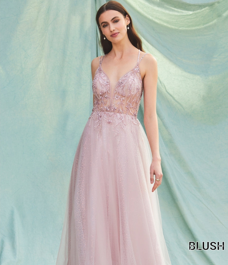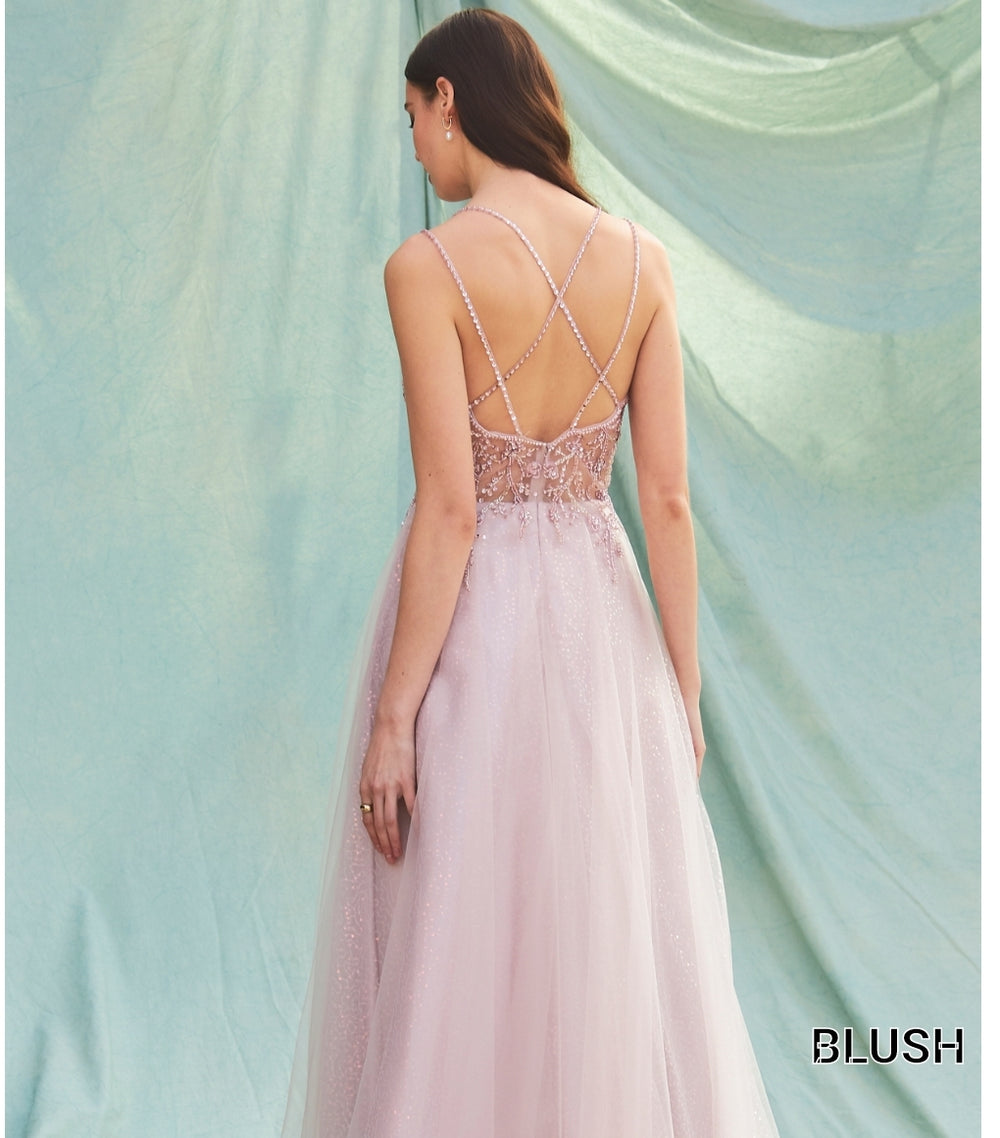This gorgeous A-line gown by Bicici & Coty will have you stand out at any event! It is beautifully adorned with beading and a cross, open back. It has a V-neckline and a flowy tulle skirt.