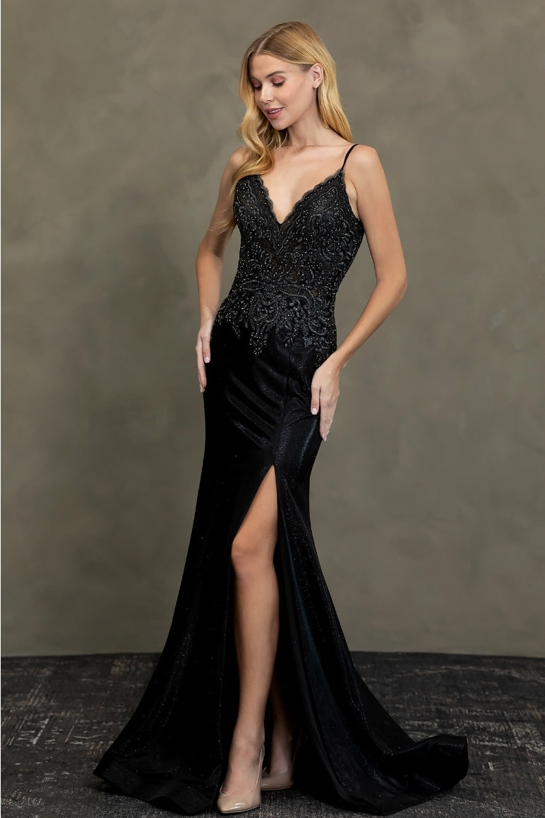 The Bicici & Coty RD202177 is a breathtakingly elegant evening dress. Crafted from glittery fabric, this sleeveless, sweetheart-cut design features a trumpet silhouette and a subtly alluring slit for a look that's both charming and refined. A must-have for any special occasion.
