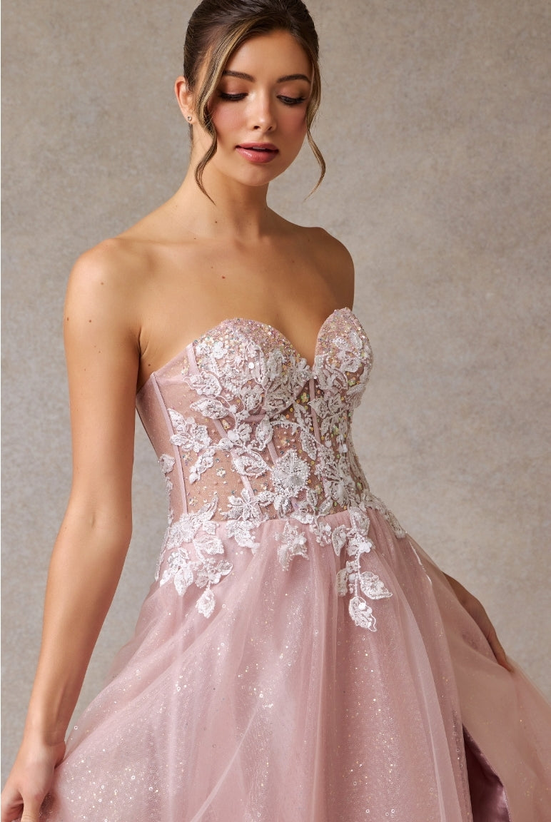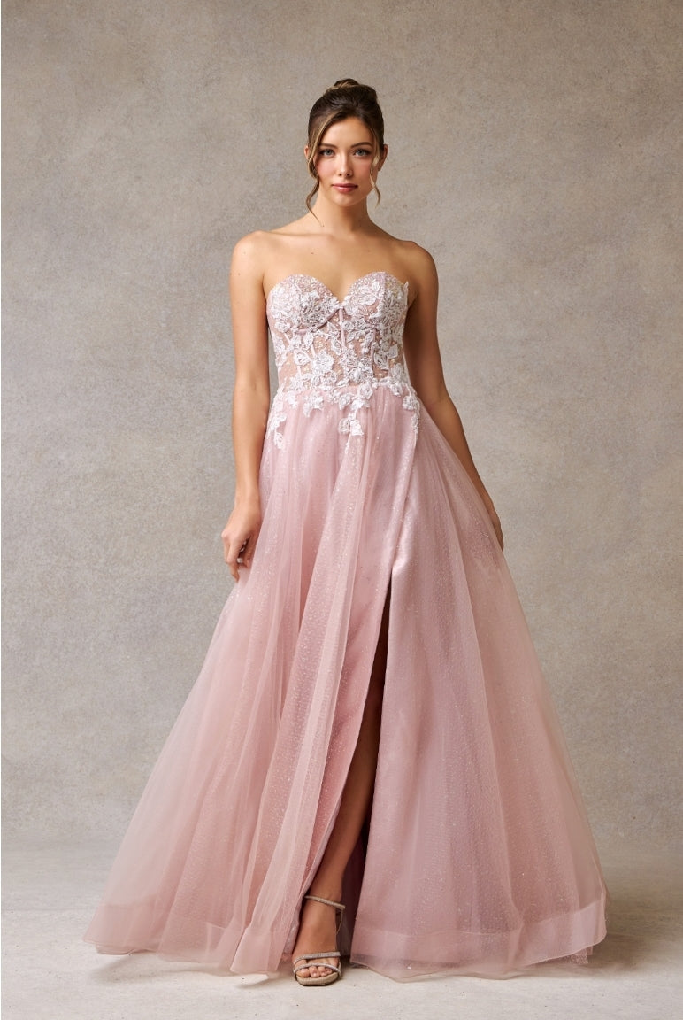 Exude elegance in our Bicici & Coty TG0965 strapless gown. The sweetheart neckline and corset top enhance your curves, while the a-line tulle skirt with leg slit adds a touch of drama. Finished with a zipper back for a perfect fit. The ultimate choice for your next special occasion.
