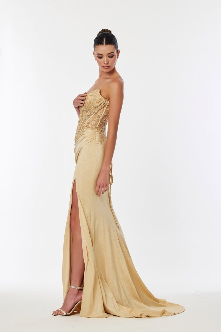 Expertly crafted with a striking strapless design and a flattering V-neckline, the Bicici & Coty LS2501 is a stunning sheath dress. The elegant slit adds a touch of allure, while the secure lace-up back ensures a perfect fit every time. Perfect for any formal occasion, this dress is both stylish and comfortable.