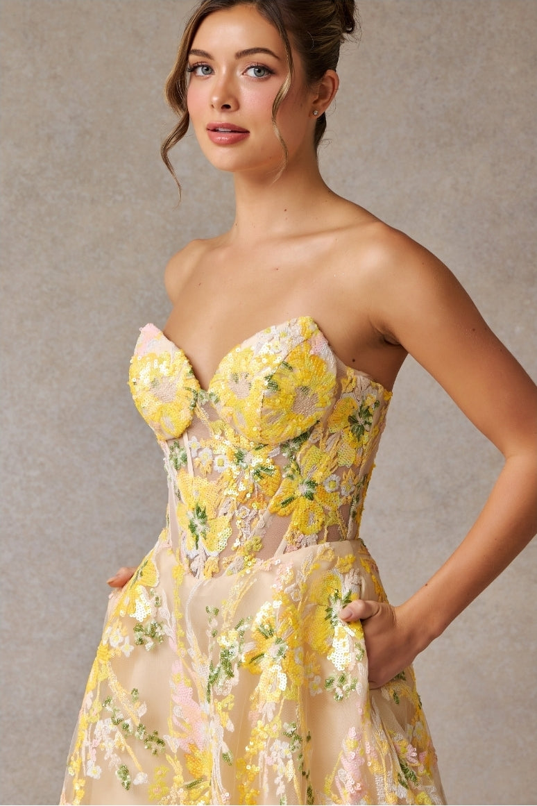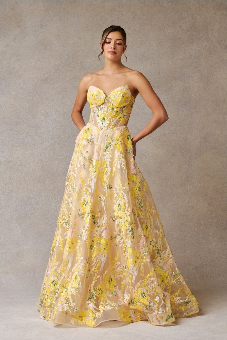 Expertly designed for comfort and style, the Bicici & Coty SP90165L features a strapless, sweetheart neckline and an A-line silhouette. Its yellow floral print and pockets make it a perfect choice for any occasion. Enjoy the perfect blend of fashion and function with this elegant dress.