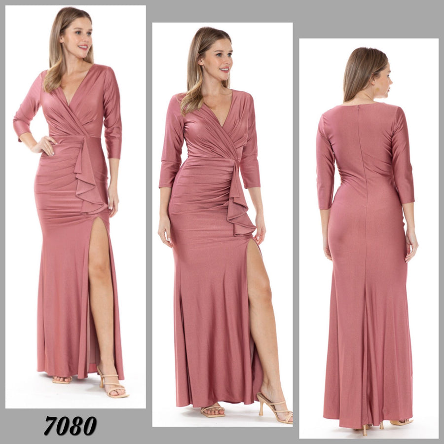 Joel 7080 is a comfortable, stylish formal gown made from stretch jersey fabric. The v neckline, 3/4 sleeves simple design provides an elegant look that is easy to wear and perfect for any occasion.