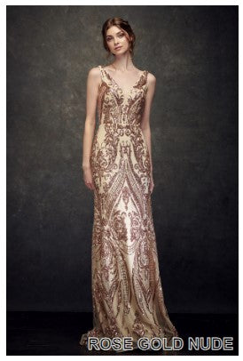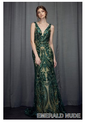 A stylish trumpet silhouette dress featuring lavish sequin embellishments. The low V-neck and backline will certainly add a touch of glamour to any special event. Ideal for proms, pageants, and galas!