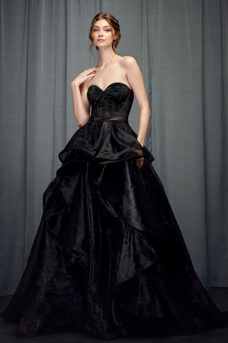 The Bicici & Coty MZ5584 dress features a gorgeous strapless sweetheart neckline and a ball gown silhouette crafted from organza fabric. The bodice is embellished with delicate beading and a fixed belt, perfect for making a statement on your special day.