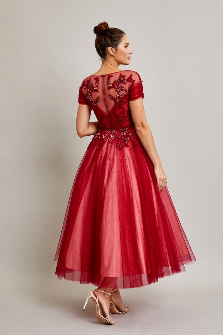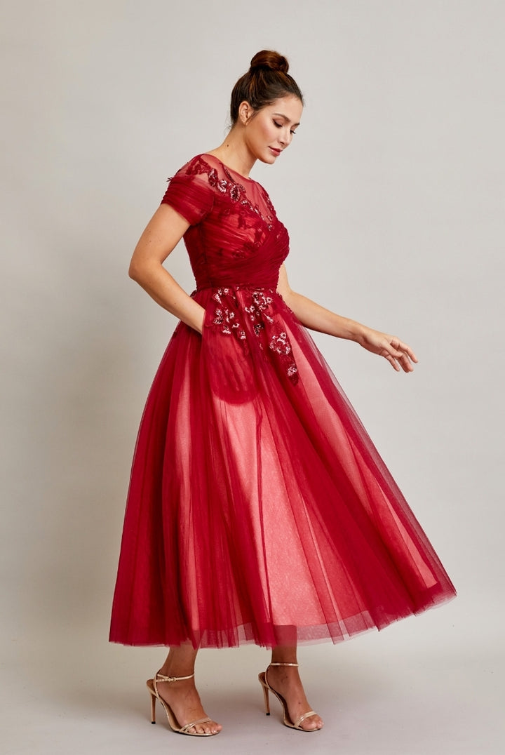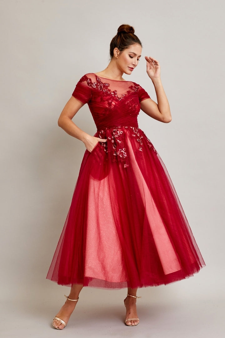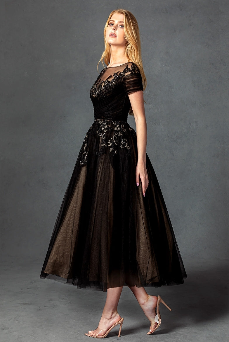 The Bicici & Coty SRW210401M is the perfect choice for a beautiful wedding dress. This dress features a luxurious A-line silhouette composed of short sleeves, a bateau neckline, and a midi length skirt. Expertly crafted from 100% polyester, the layered tulle skirt is adorned with beading, embroidery, and sequins for a timeless, elegant look.