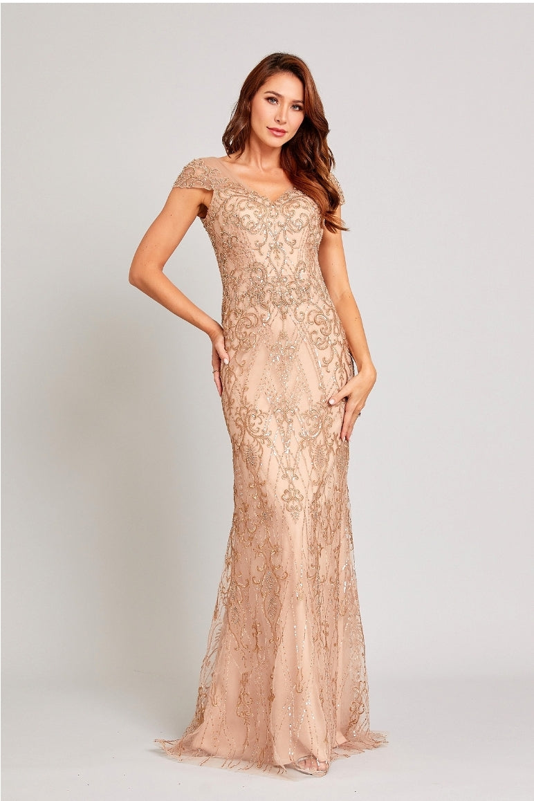 Elevate your look with the elegant Bicici & Coty PS5182 dress. Featuring a flattering cap sleeve and v-neck design, this sheath dress is perfect for the mother of the bride. The modest yet striking trumpet silhouette flatters any figure, while the scooped back adds a touch of sophistication. Perfect for any formal occasion.