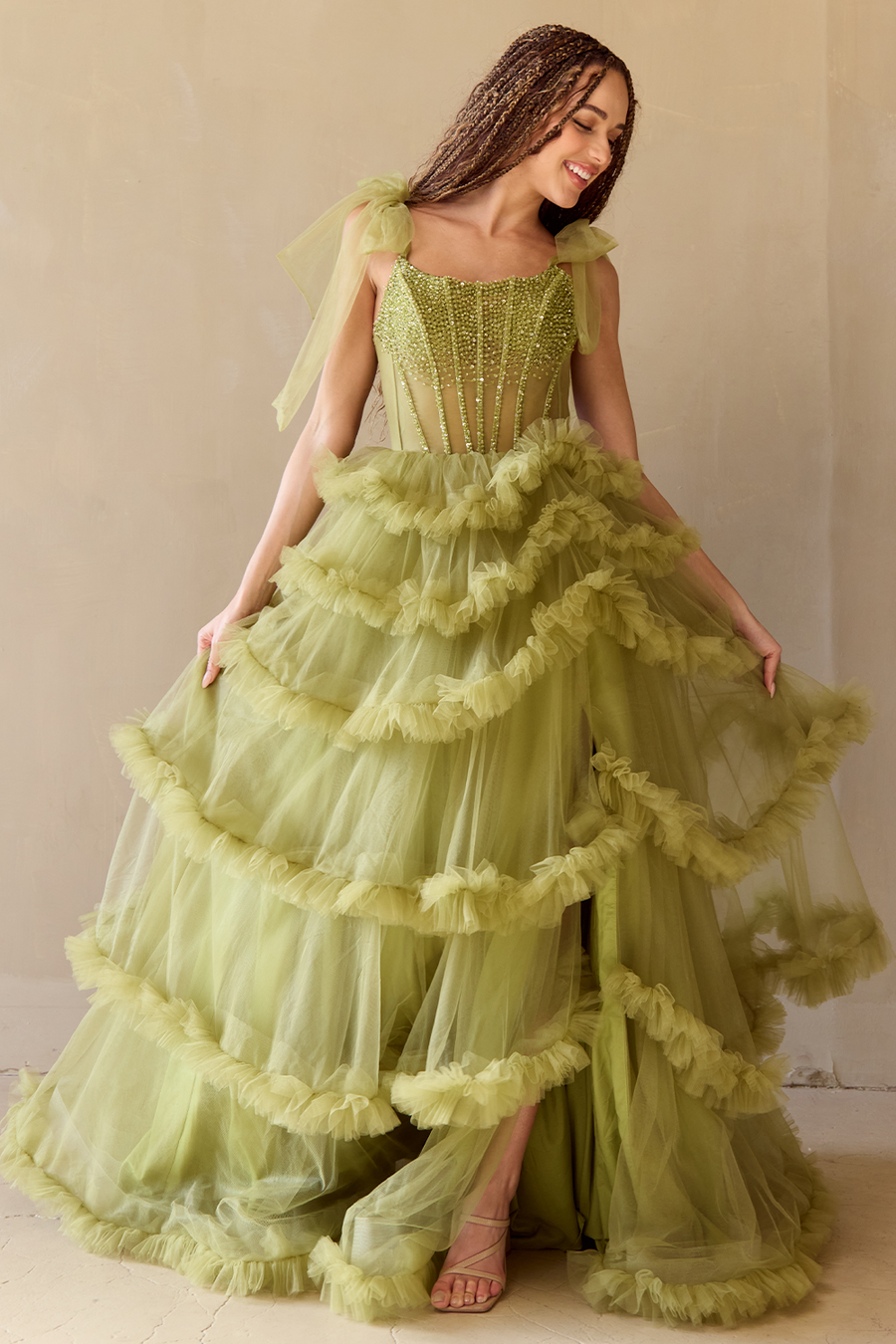 Indulge in the luxurious Amelia Couture 8900-FY091124. With tiered ruffles and extravagant details, this princess dream dress is perfect for prom and pageants. The beaded sheer bodice and corset style top create a striking silhouette, while the cross tied back adds a touch of elegance. Take your style to the next level with this exclusive and sophisticated dress.