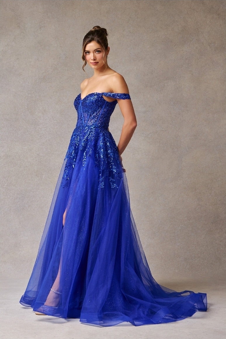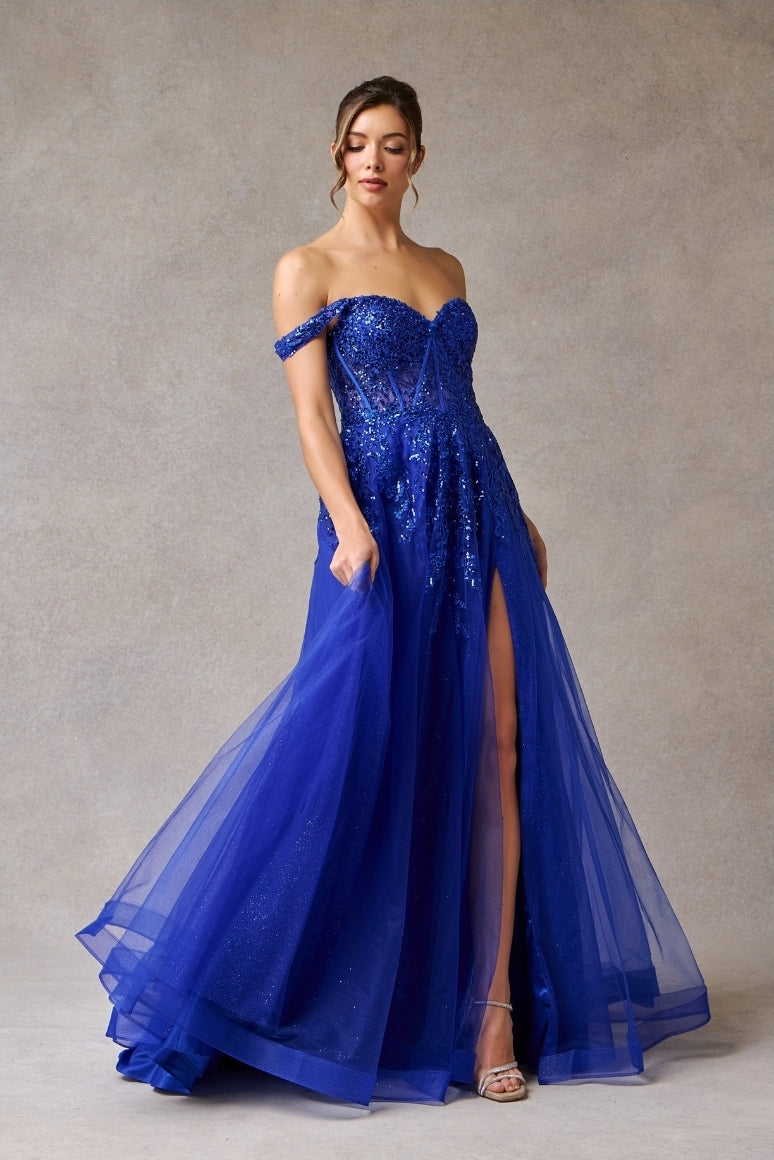 This Bicici & Coty EM6523 dress features an elegant off the shoulder design with a flattering a-line silhouette. The sequin bodice adds a touch of glamour while the zipper back ensures a secure fit. With a leg slit, this dress is perfect for special occasions.