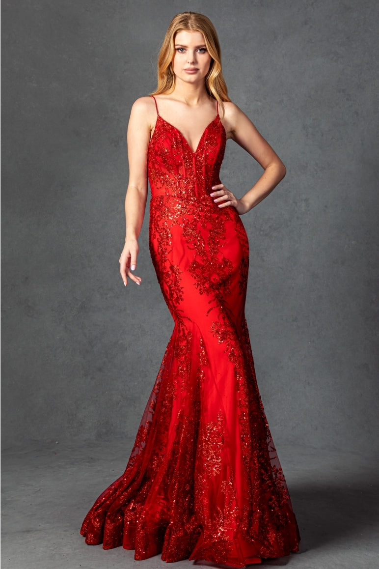 Stunning formal gown with a mermaid silhouette. Has a beautiful corset back adorned with beads and floral lace. A great choice for prom, galas, formal events, cocktail hour and pageants!